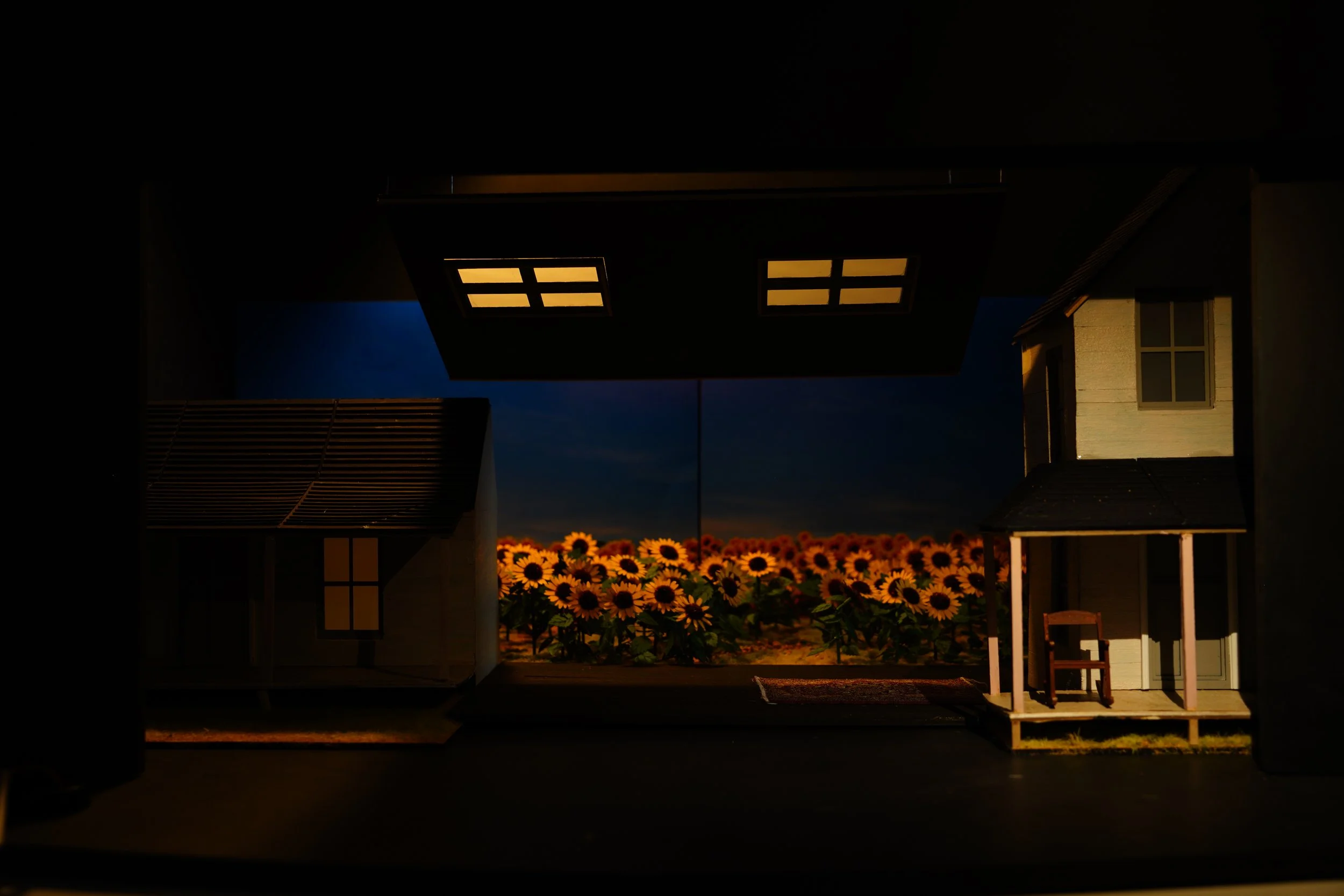 This is the stage I designed for Byone the Horizon, which mainly refers to the typical American house architecture, the small country house. The sunflower field outside the house is my understanding of the script. As you can see from the table of contents, this is a life story of an ordinary farming family. Three acts of theatre, three seasons, three lies, three main characters, three emotions, three people's choices about the future of their lives, dreams and reality, tragedy and hope, cross interpretations, meaningful. The title of the book, Beyond the Sky, can be interpreted as the pursuit of ideals and ambitions in the distance, or the limitations of ordinary people's horizons. So I borrowed the words of the sunflower, faith and bravery to be my design token.