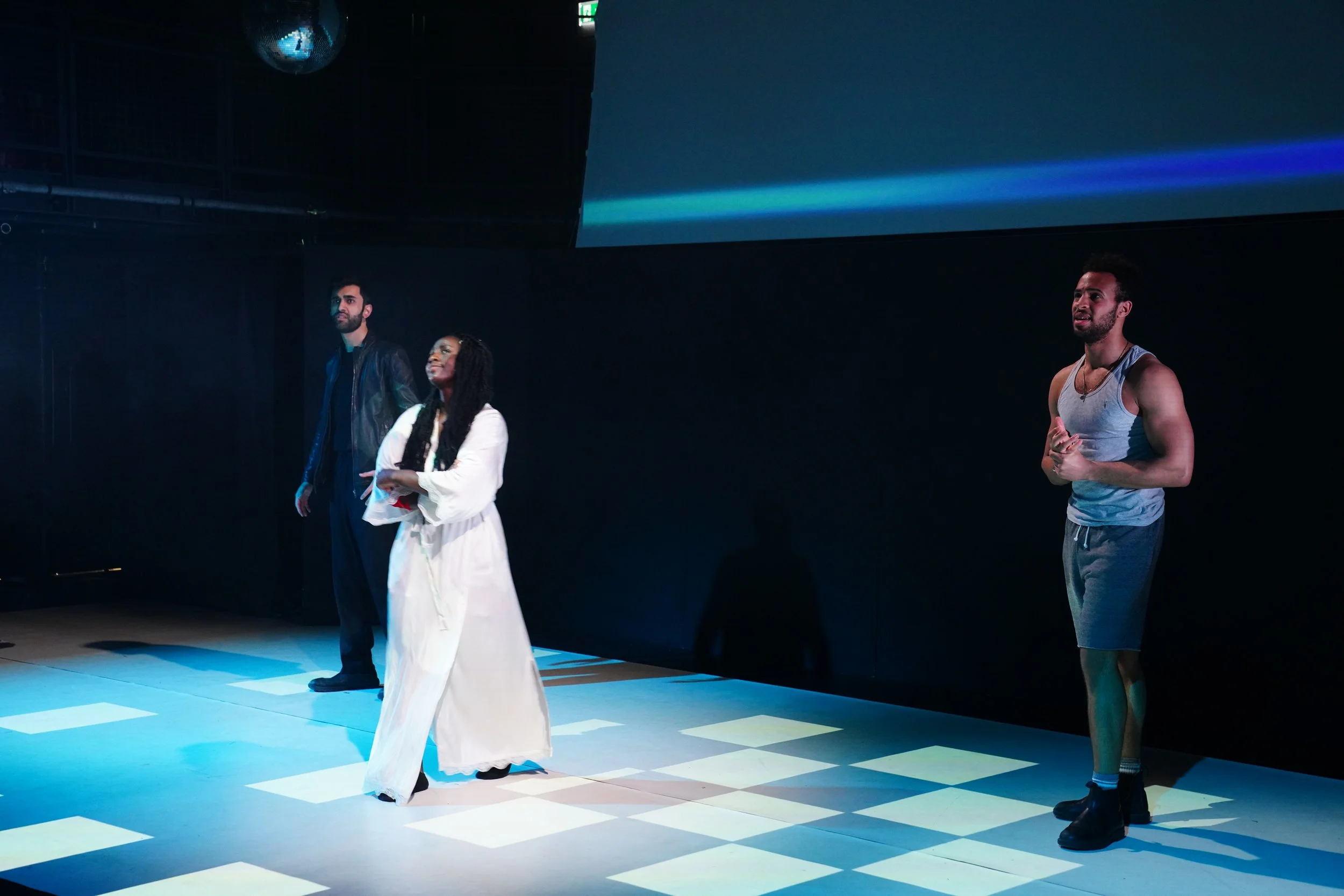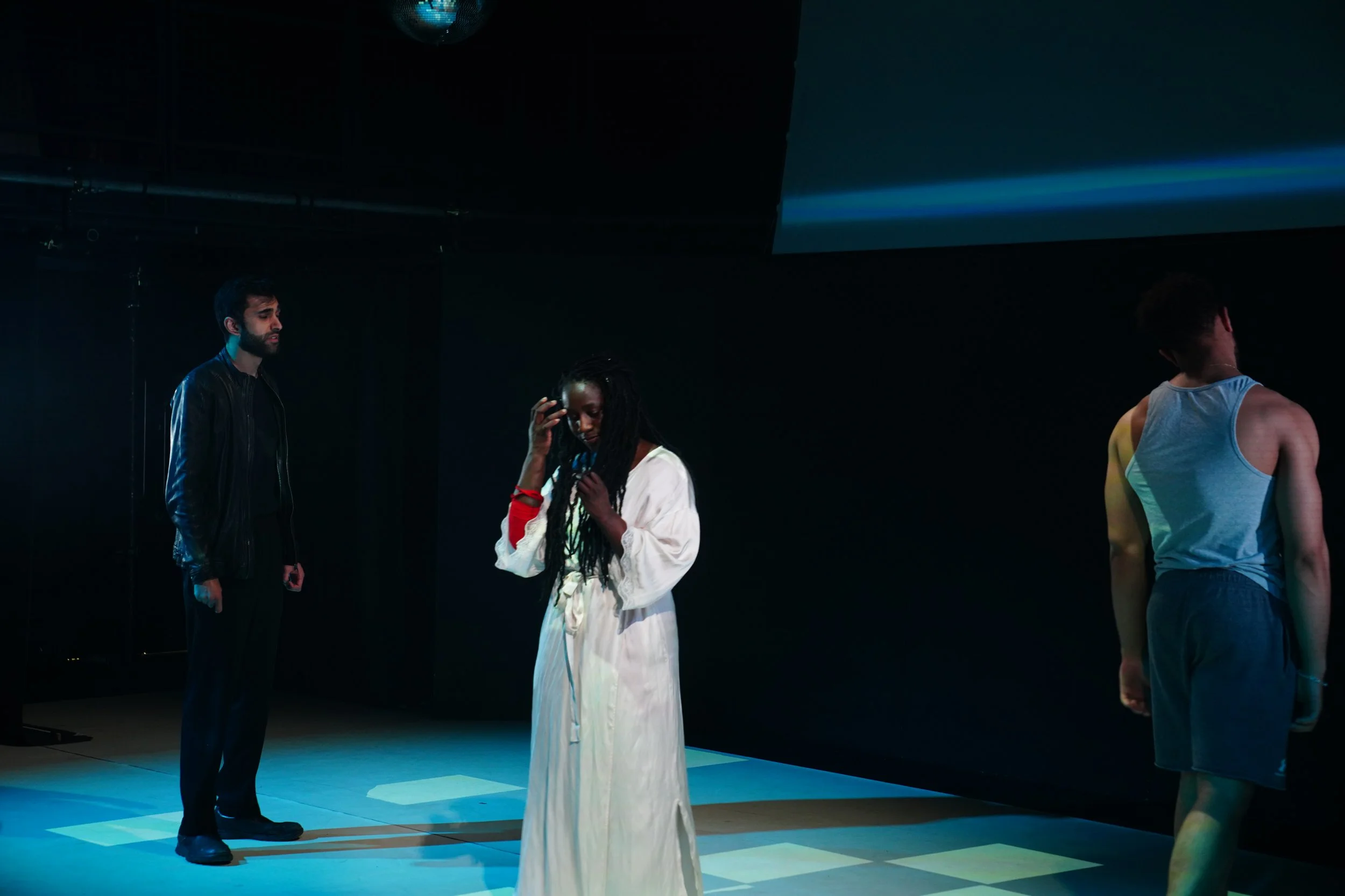 I chose to use the scene in Act III, Scene IV of Othello where Othello kills Desdemona as the basis for my creation. I wanted to go beyond the original script and create a design with a unique style. So we began to make innovative adaptations of the character Iago in the play. Our first idea was that Iago was an author who controlled the overall situation. He was directing a complete performance as a bystander and instigator, so the chessboard element in the design came from my understanding that Iago was like a manipulator, a player manipulating the chessboard. But after discussion by the production team, it was decided to use projection technology, and then I decided to follow the current hot spots and use Iago as an intelligent AI to move the time background of Othello's storyline to the modern era. This adaptation is more in line with our use of shadows and chessboard elements.